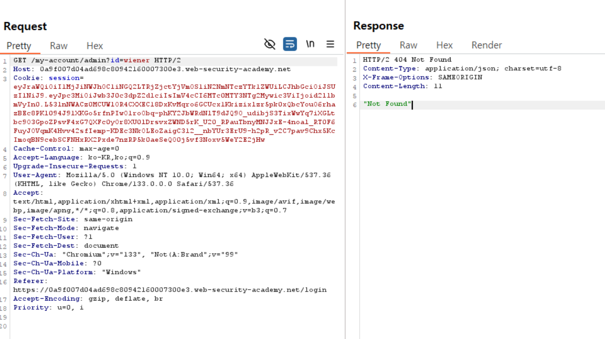 그런데 세션값이 여전히 wiener의 세션 토큰이어서 그런가 어드민 패널에는 접근이 안된다