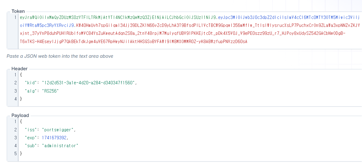 실제로는 admin 이름을 이렇게 티 나게 administrator라고 하지는 않겠으나 앞으로도 jwt 랩을 풀어보면 언젠가 취약점을 찾을 수 있겠지