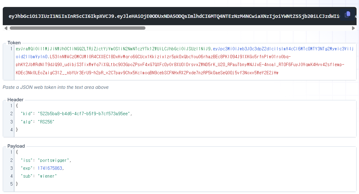 토큰 값을 JWT 디코딩해 보니까 페이로드 부분에 "sub": "wiener" 이렇게 json 형식으로 있다
