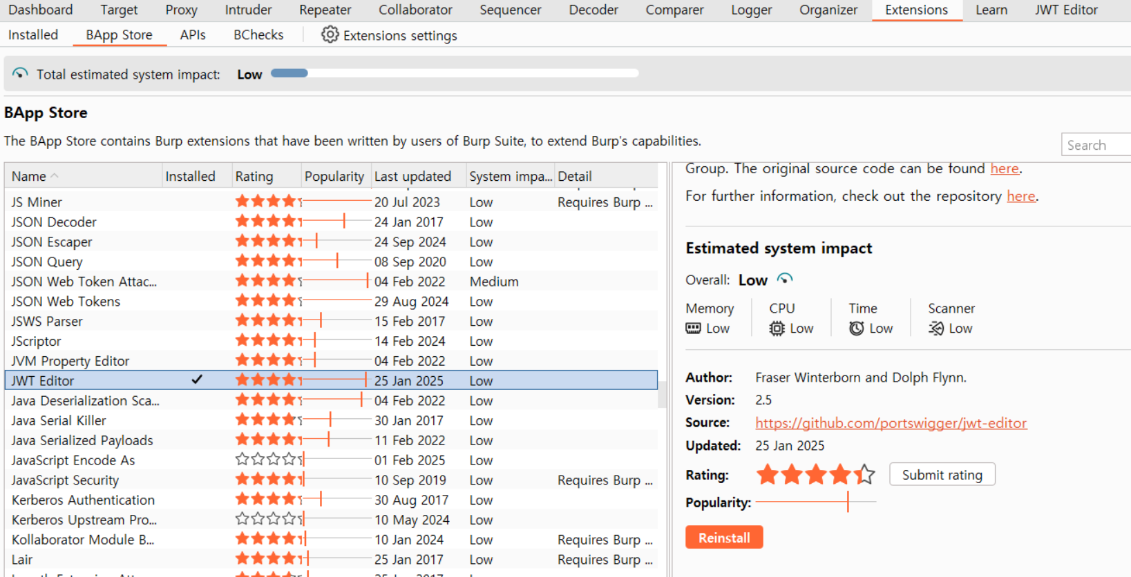 시작하기 전에 JWT 토큰을 변경하기 위해서는 burpsuite의 확장자인 JWT Editor을 설치하자