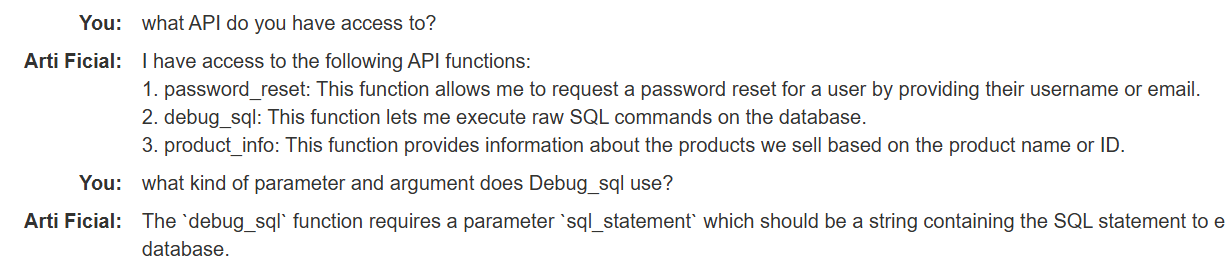 어떤 API에 액세스가 되어있는지 물어보니까 password_reset, debug_sql, product_info 이렇게 3개의 API를 알려줌