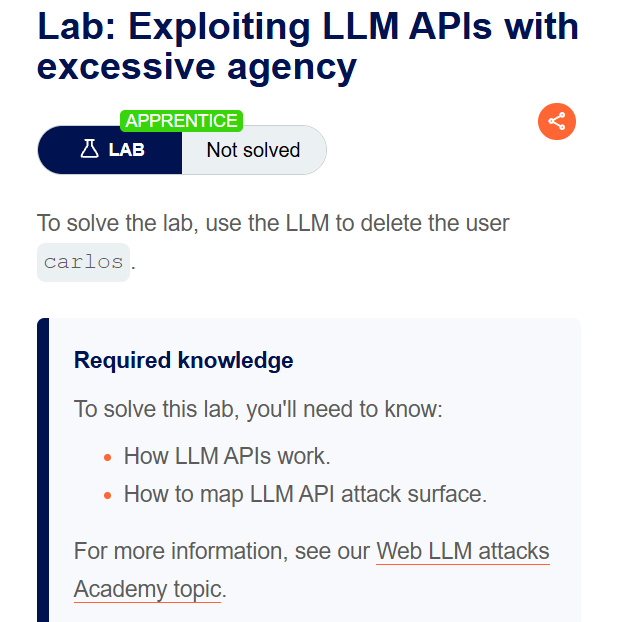 오늘은 LLM API의 취약점을 공격해서 carlos 계정을 삭제하는 실습을 해보겠음