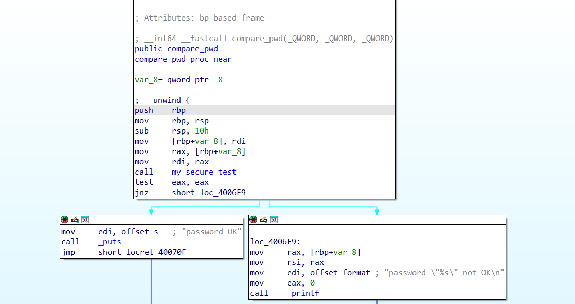compare_pwd 이름을 보면 정해진 패스워드 값이랑 일치하면 플래그를 출력해 주는 듯
