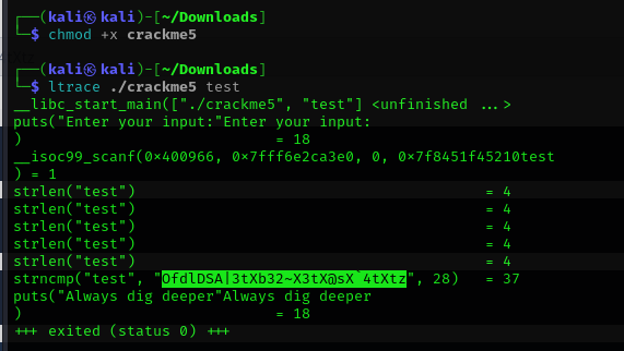 패스워드 비교 과정을 ltrace 명령어로 살펴봐도 이번엔 비교값을 안 가르쳐준다