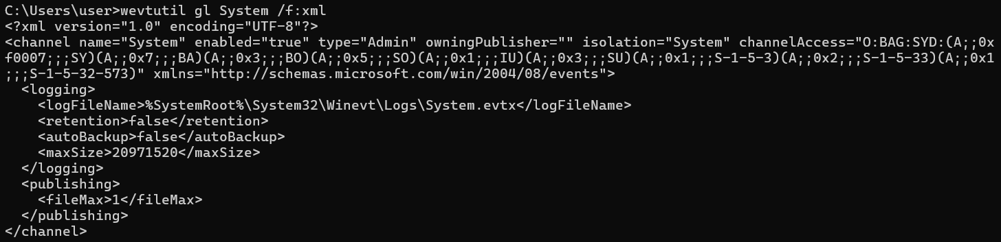 시스템 로그 구성정보를 xml 형식으로 보여준다
