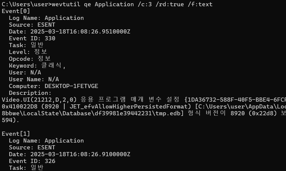 애플리케이션 로그에서 가장 최근 세개의 이벤트를 텍스트 형식으로 보여준다