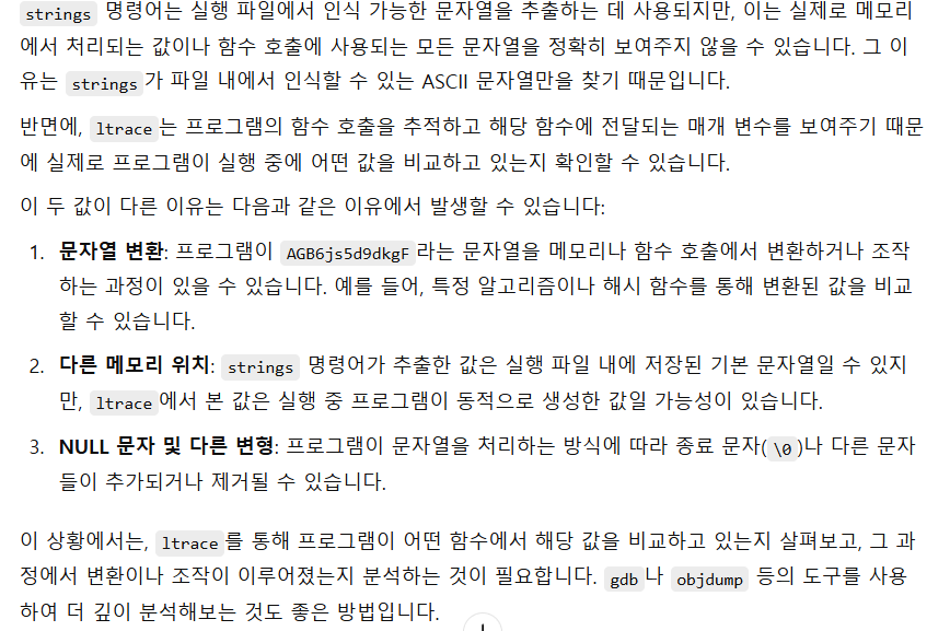 ltrace 명령어는 실제로 프로그램에서 비교하는 동적 값을 보여줘서 다르게 나타나는듯