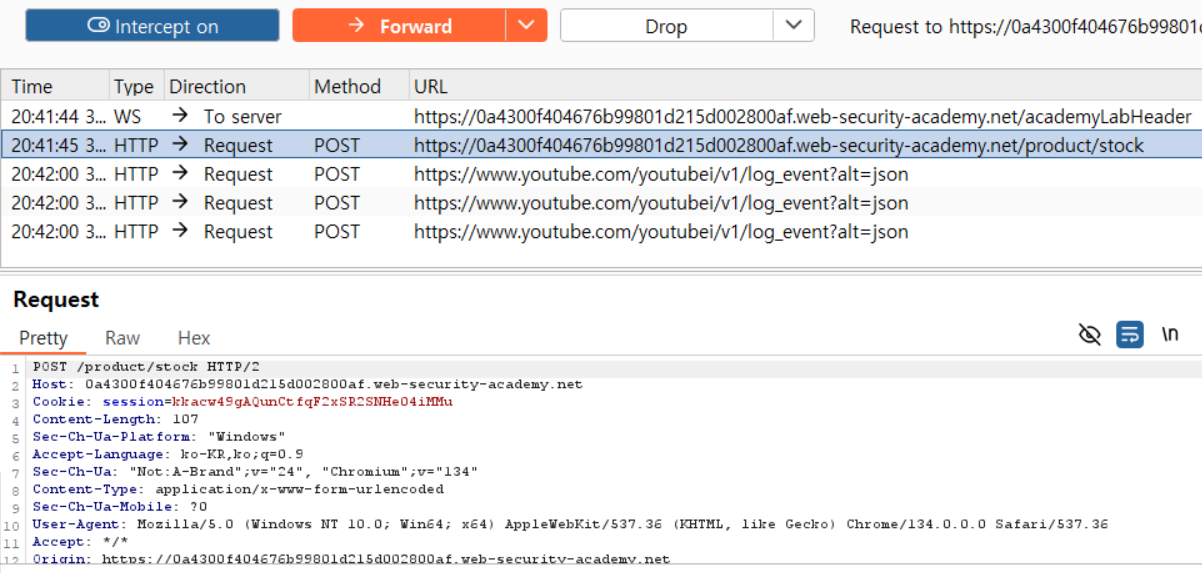 위치는 임의로 런던으로 세팅한 후 재고확인을 하는 파켓을 burpsuite에서 인터셉트해보자