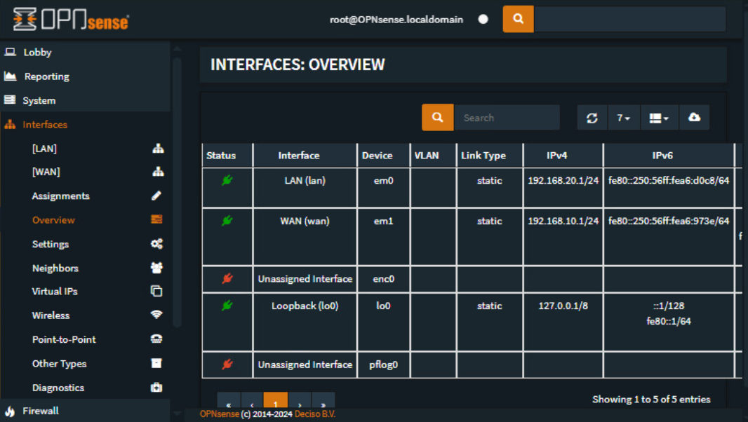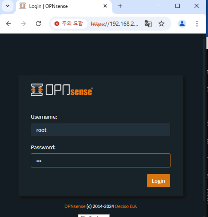 방화벽 OPNSense는 두 네트워크 카드로 양쪽에 연결되어 있는 상황이다