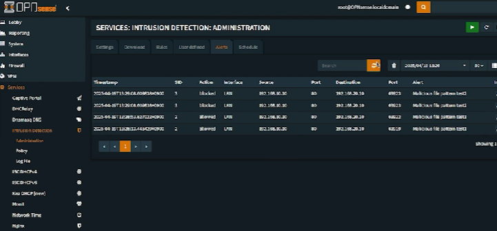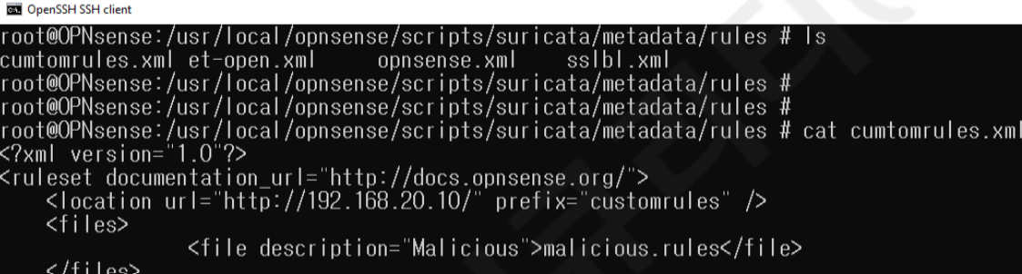 - OPNSense 내에 설치된 suricata IPS, IDS에 악성코드 차단 정책 등록