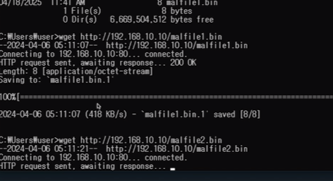 다시 윈도우 데스크탑으로 돌아와서 wget으로 악성파일을 다운로드 해보겠음