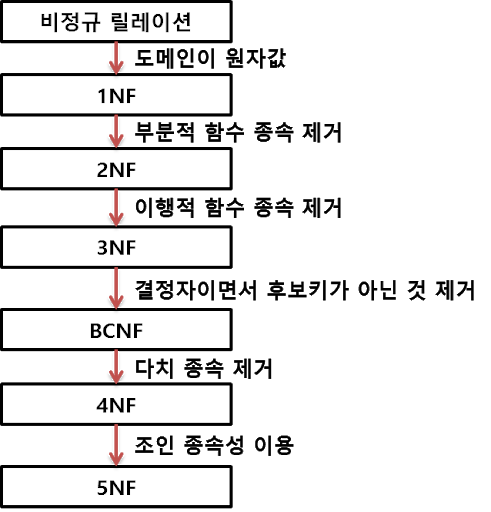 - 물리적 설계: 각 DBMS 특성에 맞게 DB의 저장구조를 변환, 반 정규화 수행