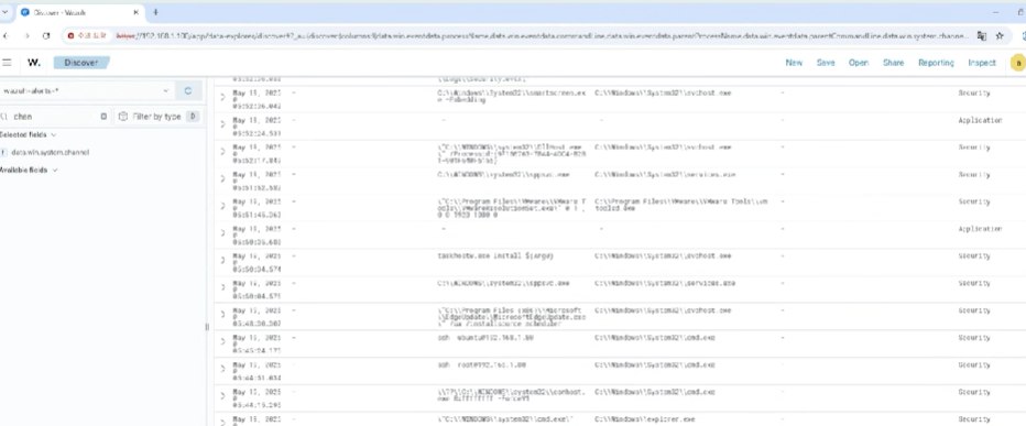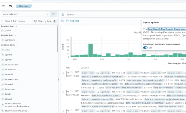 Wazuh 플랫폼에서 Discover 메뉴에 가면 수집된 로그 데이터를 필터링, 분석할 수 있는 도구가 있음