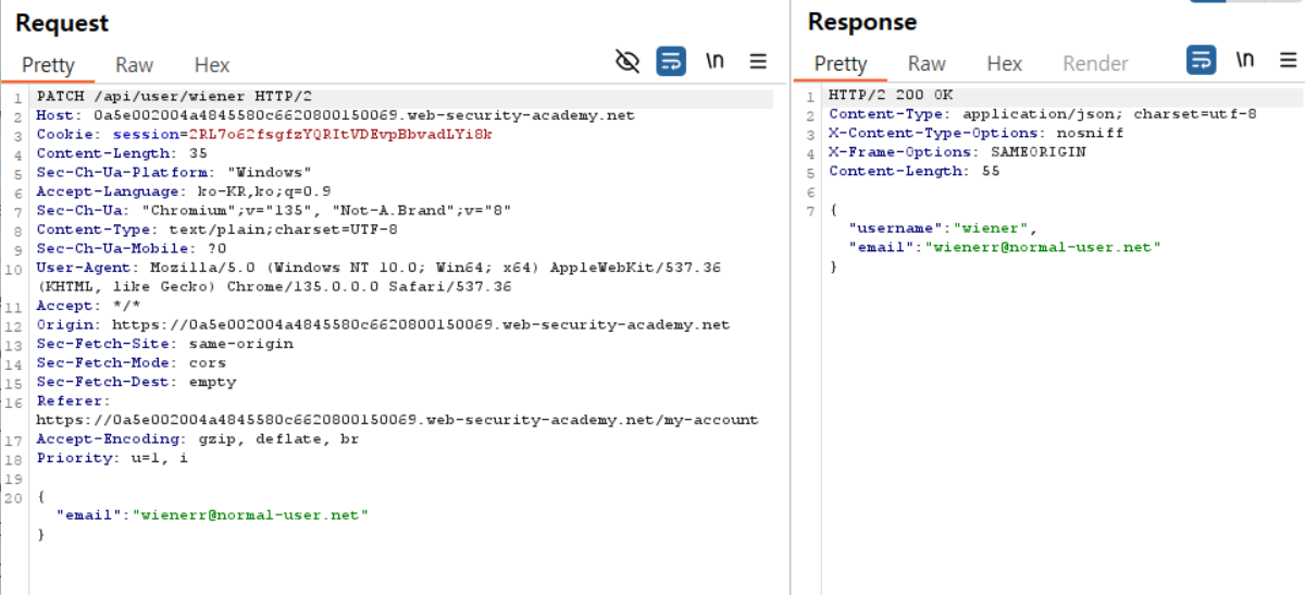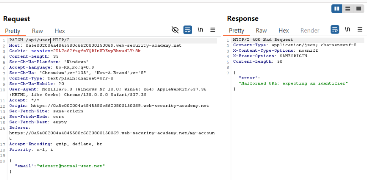 여기서는 PATCH /api/user/wiener에서 계정명을 삭제하고 /api/user만 적어서 보냄