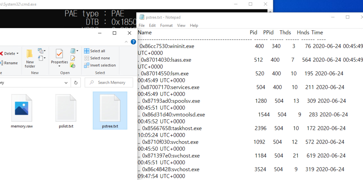 volatiliy25 -f memory.raw —profile=Win7SP1x86 pstree> pstree.txt