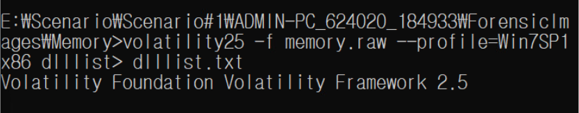 volatiliy25 -f memory.raw —profile=Win7SP1x86 dlllist> dlllist.txt