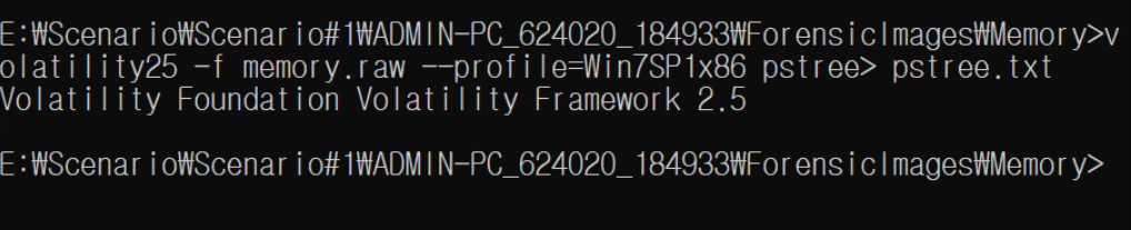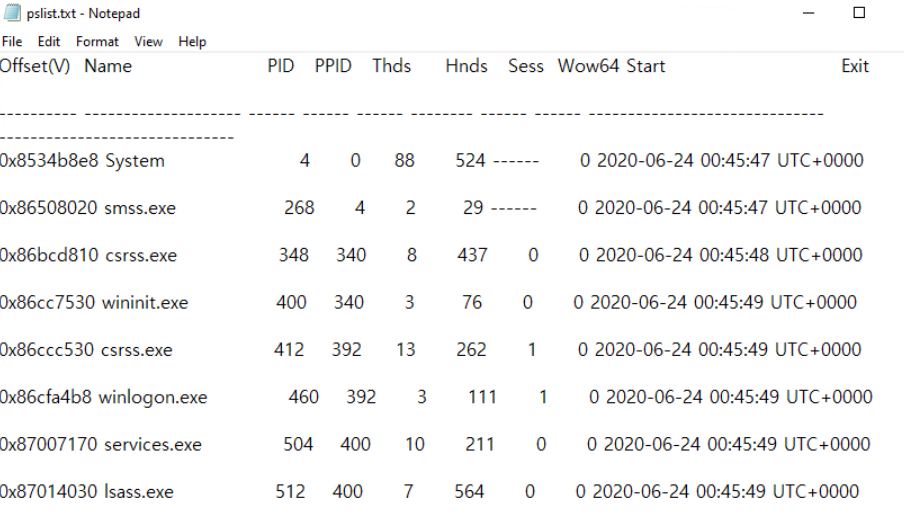 volatility25 -f memory.raw --profile=Win7SP1 x86 pslist> pslist.txt