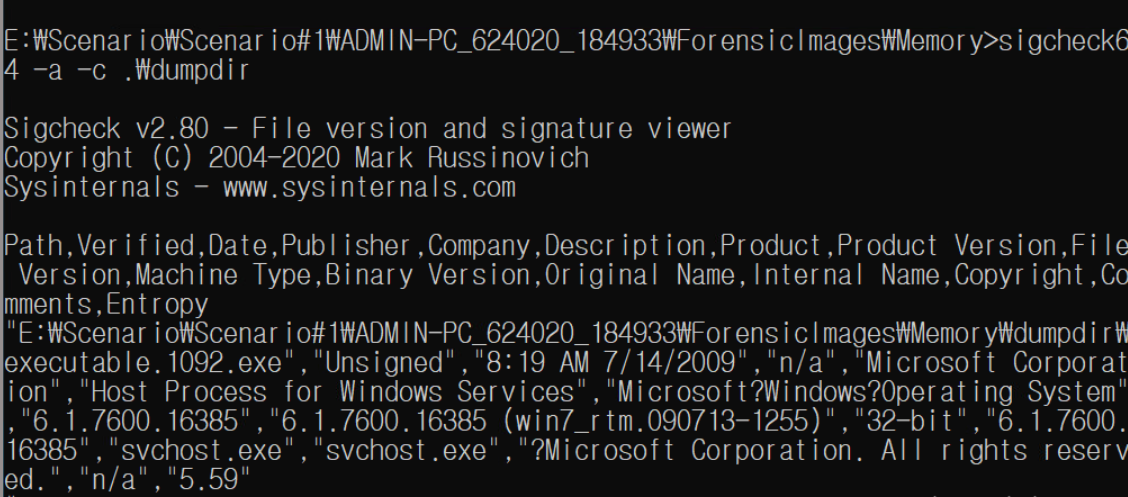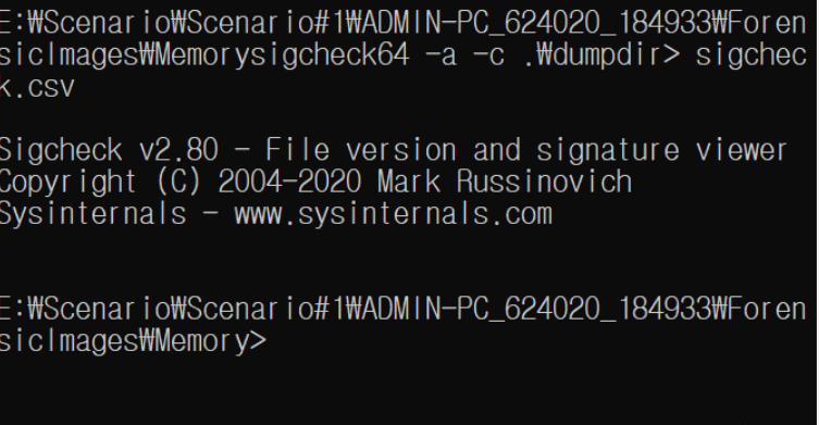> Sysinternals의 도구에 해당하는 sigcheck는 dumpdir 내 파일의