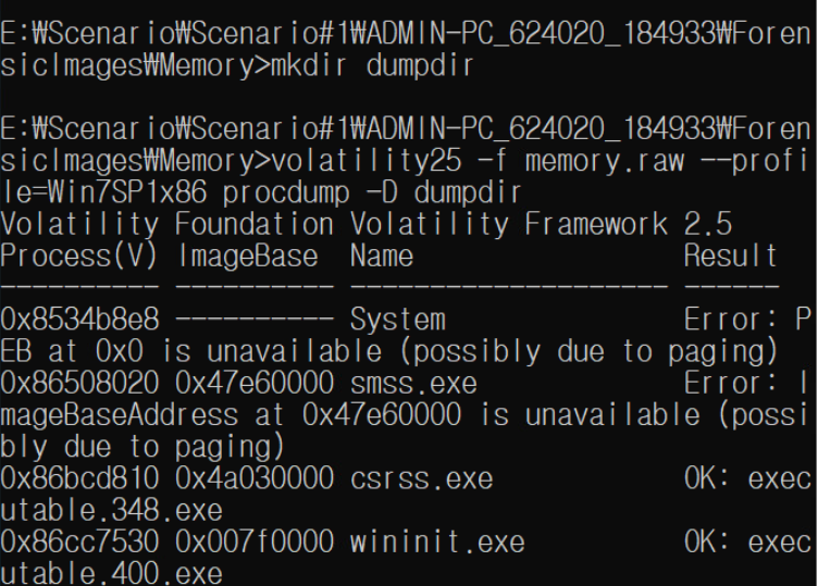 \Memory> volatility2.5 -f memory.raw --profile=Win7SP1x86 procdump -D dumpdir