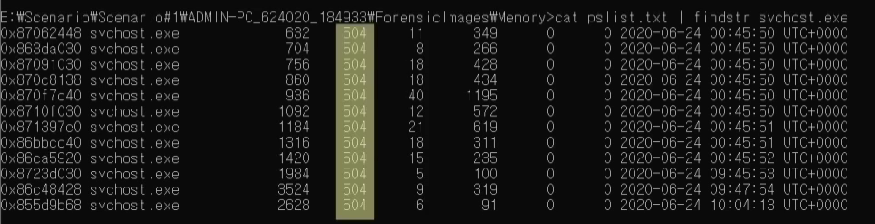 좀 더 편하게 보기위해 pslist를 대신 사용하고 svchost.exe만 필터링해보자