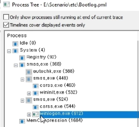 | smss.exe | session management process, 부팅될때 로그인 이전에 최초로 실행되는 취상위 프로세스 중 하나. 마스터 smss.exe가 새로운 세션을 위해 smss.exe를 생성하고 그 하위에 csrss/wininit/winlogon.exe 등이 생성됨. 이후 마스터 smss는 종료되므로 하위 smss들의 ppid는 동일 |