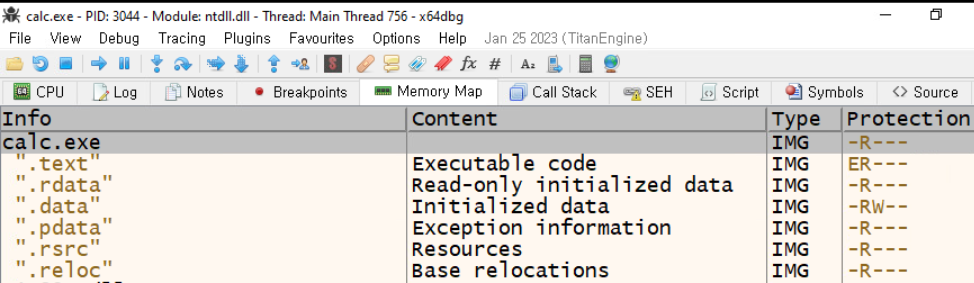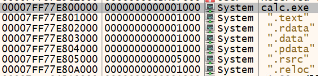 → calc.exe가 로드된 주소가 00007FF77E800000 라는게 확인되고 .text 등의 섹션들도 확인가능