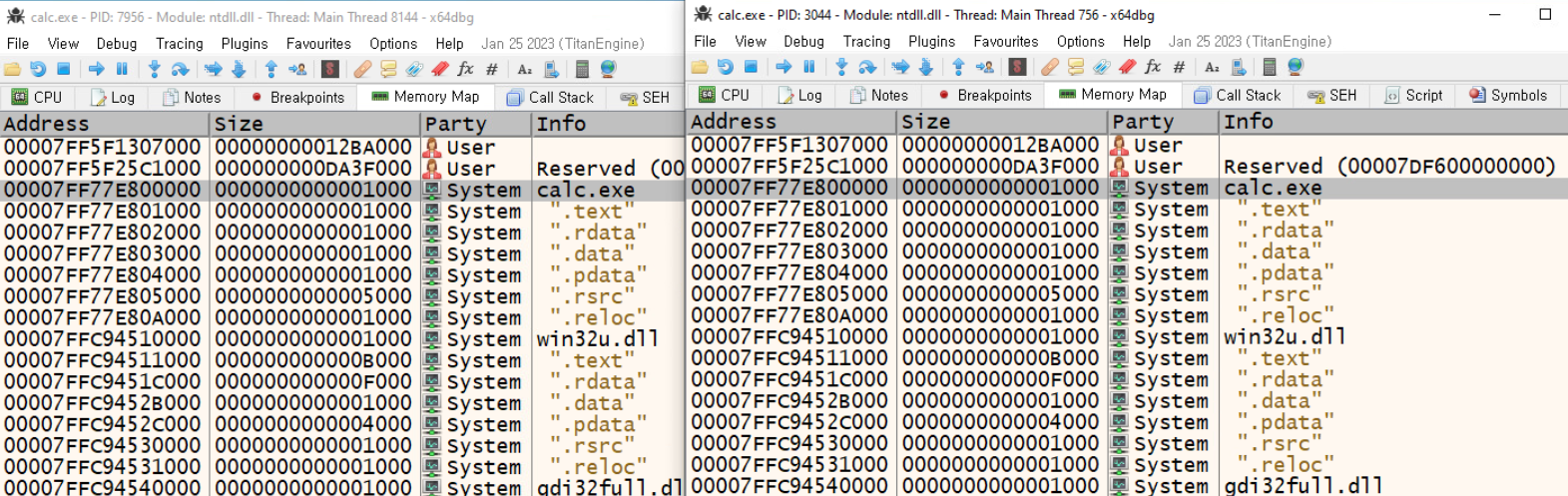 x64dbg와 calc.exe를 각각 실행해 보면 둘 다 vas가 동일하다