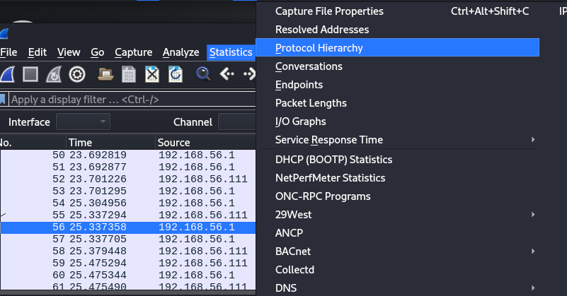 상단의 메뉴바에서 통계를 선택하면 protocol hierarchy를 선택가능하다.