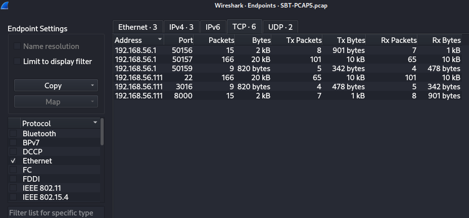 엔드포인트에서는 캡쳐에서 있는 각 호스트들이 송/수신하는 파켓의 양을 보여준다.