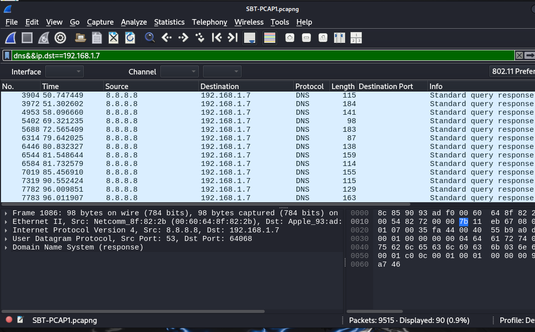 dns&&ip.dst==192.168.1.7을 검색해 보니 파켓들이 필터링되고