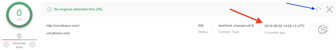 이미지에서 보면 해당 주소는 무해하다고 하지만 9개월 전에 스캔되었기 때문에 파란 화살표로 다시 스캔하는 게 좋다