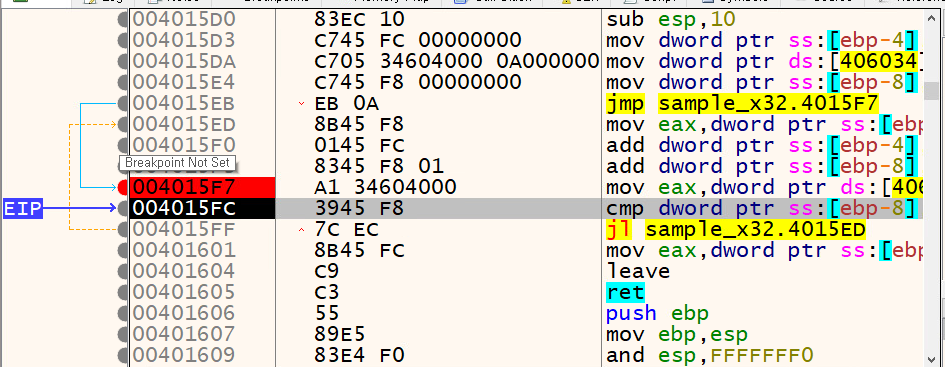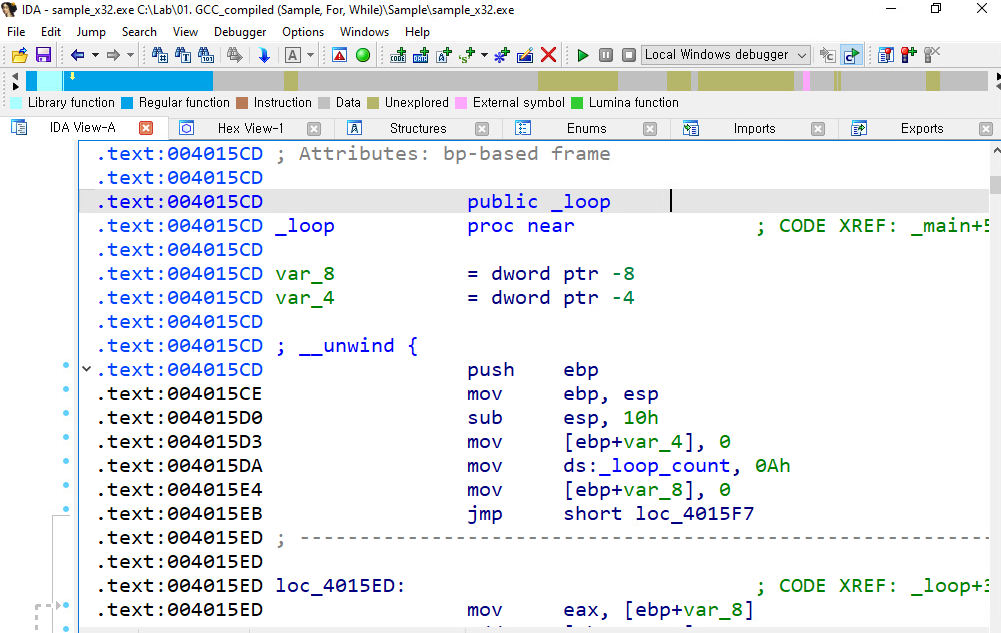 F7을 눌러서 한 줄씩 실행해보면 loop count(ebp-8)가 10이 될때까지 계속 순환하다가 10이 되면 빠져나온다
