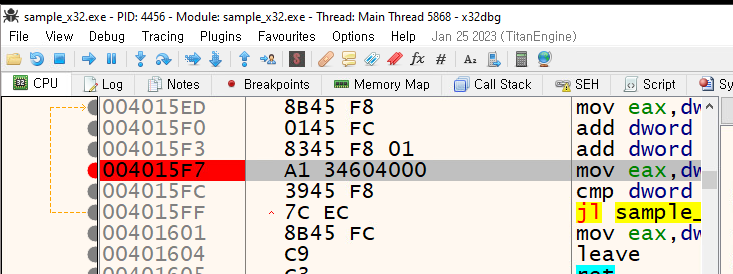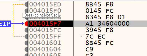 루프함수를 살펴보고 0040F7에 브레이크포인트를 걸어보자