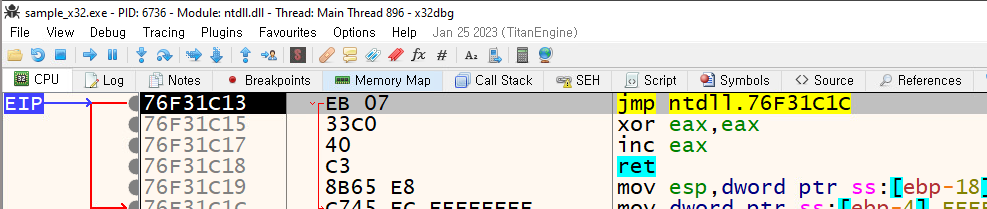 - 의미상 POP EIP 명령어와 동일(의미상 그렇다는거고 실제로는 eip 직접 수정 불가하므로 사용불가)