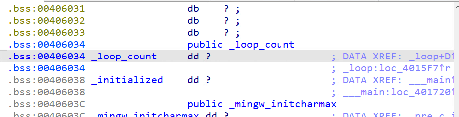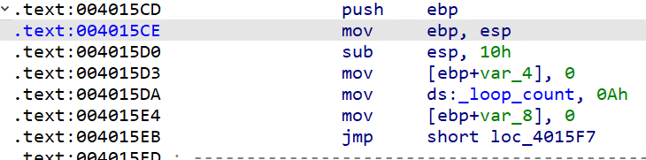 0A, 즉 10이 루프카운트 값에 들어가있고 .ds:_loop_count 값을 자세히 살펴보면 전역변수인데 그 이유는