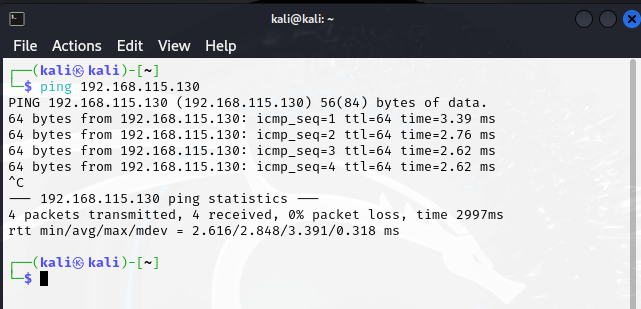 Kali 리눅스 터미널에서 해당 ip주소에 ping을 날리니까 네트워크 파켓 통신이 이뤄지고있다