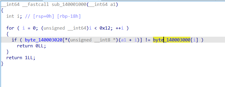 byte_140003020[a1[i]]!= byte_140003000[i]