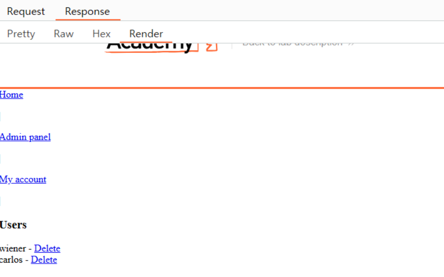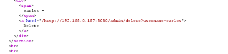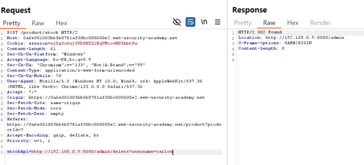carlos 계정을 삭제하는 위의 URL을 repeater에서 stockApi에 넣었음