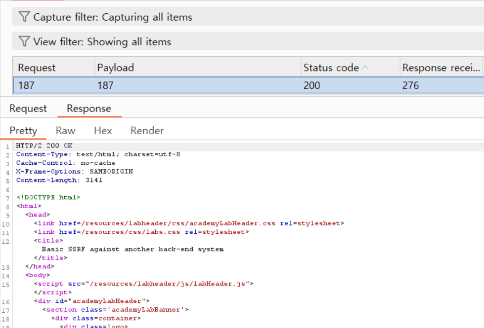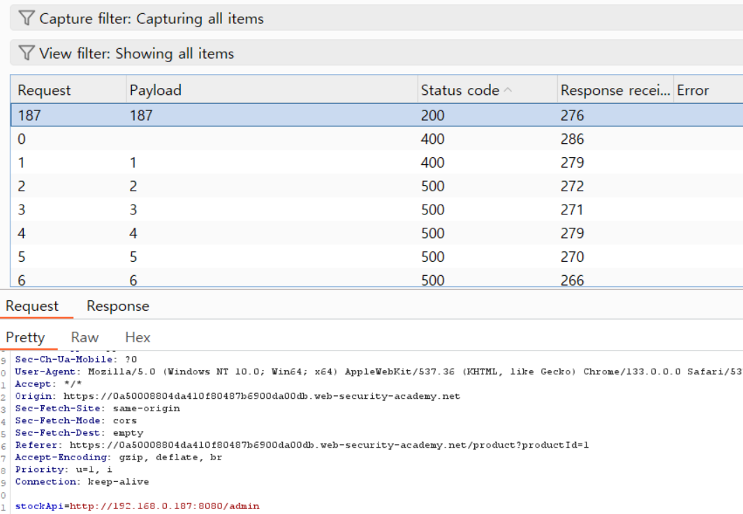 유일하게 200으로 성공한 페이로드가 발견됐다